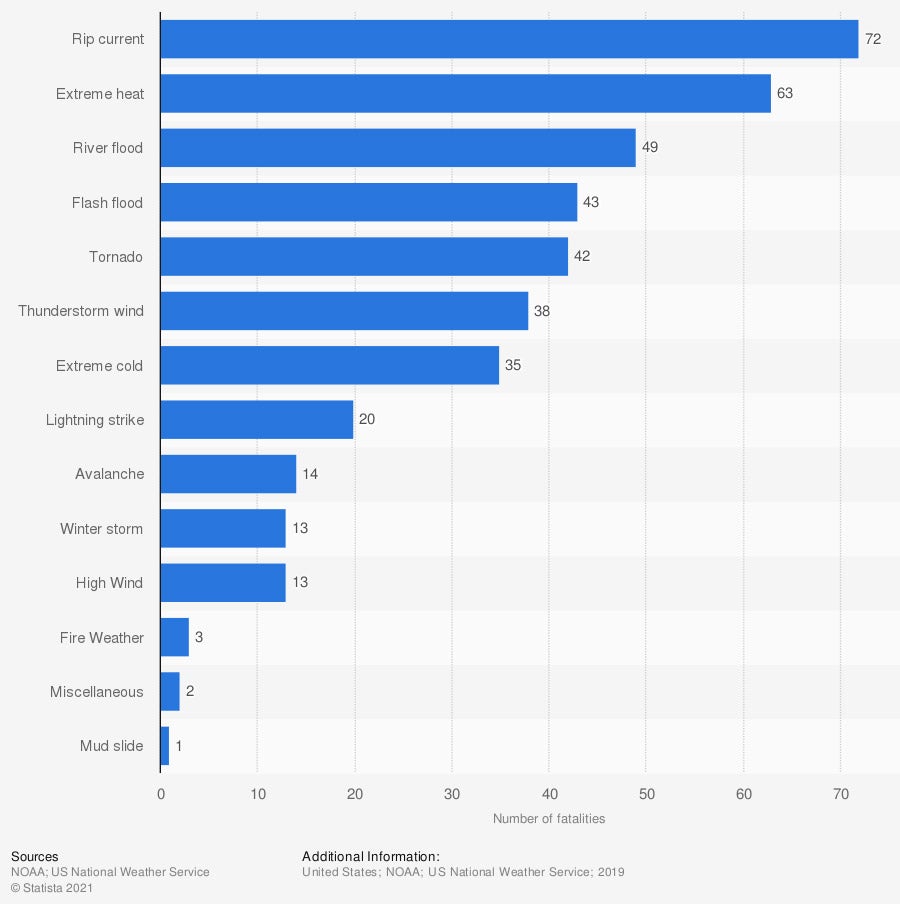 Graphic #2: https://www.statista.com/statistics/203766/fatalities-caused-by-weather-conditions-and-storms-in-the-us/