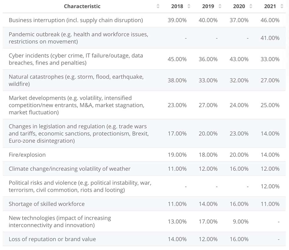 Leading risks to businesses in the US in recent years