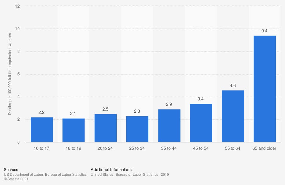 In 2019, the occupational injury death rate for workers aged 65 and older stood at 9.4. Fatal work injury rates for workers 55 years of age and over were higher than the overall US rate of 3.5, and the rate for workers 65 years of age and over was almost three times the rate for all workers.