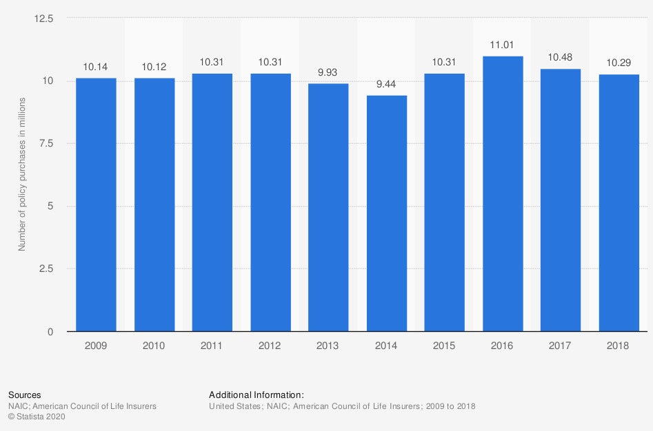 In 2018, about 10.3 million individual life insurance policies were purchased in the United States.