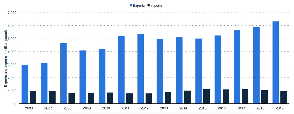 Total US pork imports and exports from 2006 to 2019 (in million pounds)